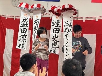 あきばで今年二十歳ことしはたちになられるかたのおいわいをしました~♪「は・た・ち」になるってなんだか特別とくべつかんじですよね♡あきばのみんなに祝福しゅくふくされてれながらも立派りっぱにインタビューにもこたえてくれました!